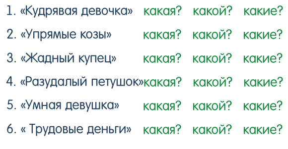 В названиях сказок найди имена прилагательные. На какой вопрос они отвечают? Выбери правильный вопрос.